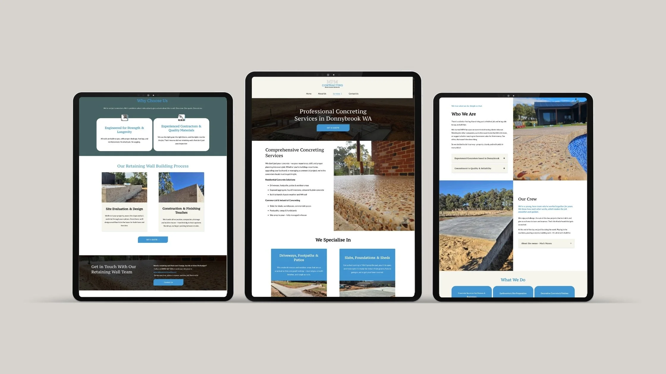 We teamed up with MPM Contracting, the go-to concreters, earth-movers, and retaining-wall experts in South West WA to craft a site that reflects their all-in-house, no-fluff approach. Clean layouts, clear services (concreting, retaining walls, earthworks), and a friendly, local voice make the website feel as reliable as their heavy equipment. No hidden catches, just honest work showcased online.